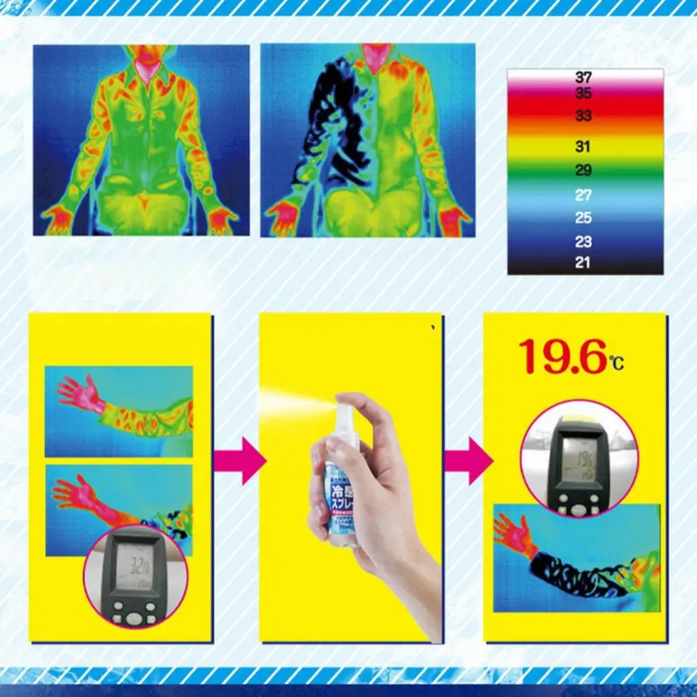 4.Easy to Use: This cooling spray gives you a refreshing sensation in seconds. Just spray it directly from the clothes more than 10cm away for a better effect. You only need to spray 3-5 times each time and you can use it on your armpits, back, neck, or any other areas that need cooling. It's easy to use and convenient to carry.