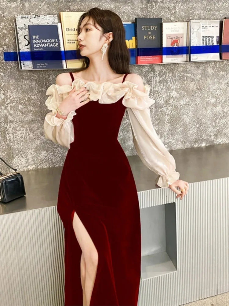 Women's Elegant Red Ruffles Slash Neck Evening Party Dress Puff Sleeve Off Shoulder Split Wedding Prom Robe Female Vestidos